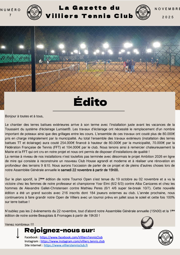 Les dernières semaines ont été marquées par de belles avancées sur nos installations et par un tournoi d’automne particulièrement animé, sans oublier nos jeunes qui continuent de briller sur les courts.