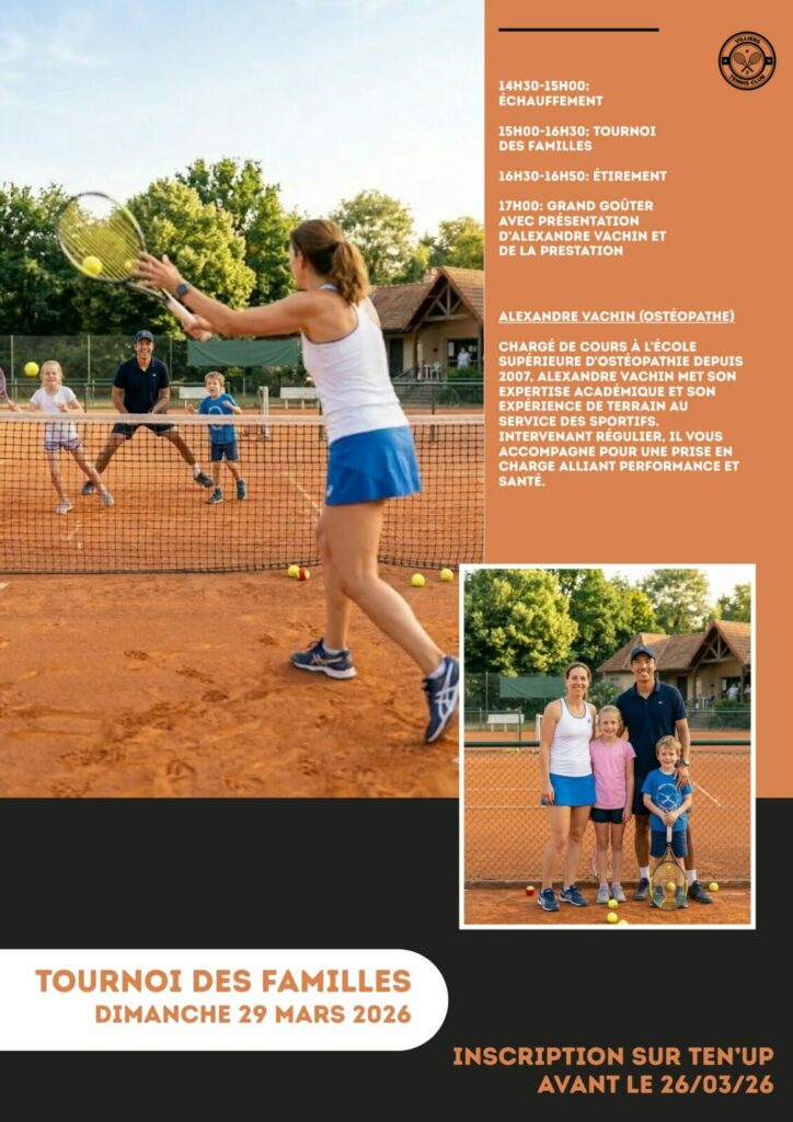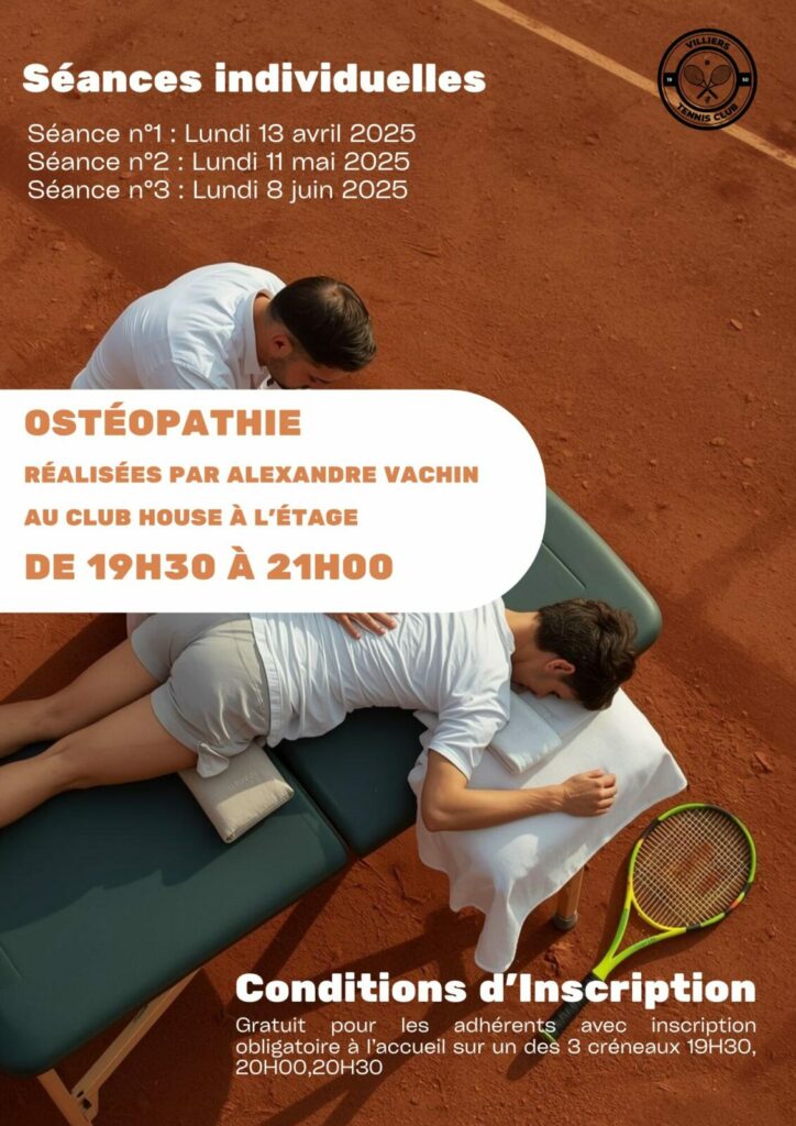 Le club a le plaisir de proposer à ses adhérents des séances individuelles d’ostéopathie, animées par Alexandre Vachin. Que ce soit pour optimiser vos performances, favoriser la récupération après l’effort ou traiter des tensions spécifiques liées à la pratique du tennis, profitez de cette expertise directement au sein de votre club ! Calendrier des séances […]
